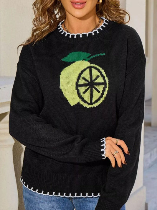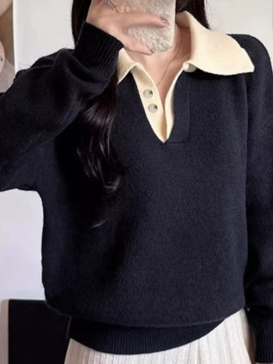 Bow Print 2-Tone Rhombus Knit Loose Sweater